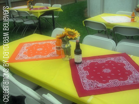 I really wanted to convey a sweet, simple, homemade aesthetic to the party and these centerpieces were just perfect! I created a mock-table runner using bandannas. Super easy and very inexpensive (love that!)