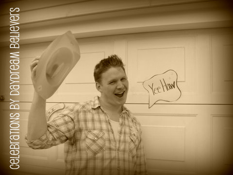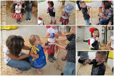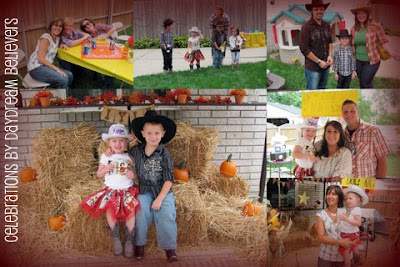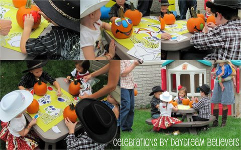 In addition to the horses, cowboy gear and the silly bands; each little guest took home their pumpkin, a small cowboy coloring book and crayon set {ordered here} and a package of trail mix. We put the trail mix in clear cello bags and tied each bag with shiny ribbon and a "Happy Trails" tag {from Chachke Designs}Unfortunately, I didn't get a picture of the favor bags - oops!
