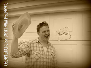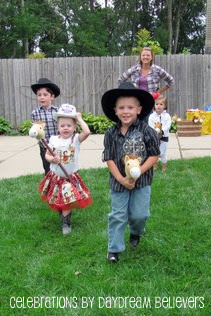 So the very best thing about having a mumma who designs clothes has to be that you always have the perfect outfit for very special occasions, right? ;) Here is a pic of the birthday girl in her "Cowboy Cutie" birthday party attire :) Her shirt features 3 adorable cowboys (b/c she's 3!) and I made sure her skirt was extra twirly --just right for dancing the day away! ;) Her leather cowboy boots were a total score from a children's resale store ($9! Yea!) and her hat was a plain child's dress up hat that I embellished with a birthday-girl tiara to make it more special.