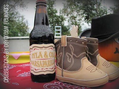 Our menu: Southern Fried Chicken, Golden Nuggets {aka chicken nuggets for the kidlets}, BBQ Beans, Taters {potato salad}, Horse Feed {coleslaw, fruits & veggies}, Gigi's Special Sweet Hot Apples, and chips w/homemade salsa - yum! Drinks were sweet southern style iced tea and sarsaparillas -- Our sarsaparillas were bottles of IBC Rootbeer, Orange Crush, and H20 decorated with super cool personalized sarsaparilla labels. {Read all about the labels here}