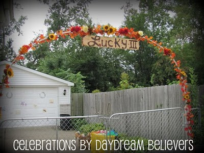 | The arch was made from pvc piping wrapped in leaf garlands and embellished with fall flowers. The "Lucky III" Ranch sign was made from wood & spray paint. |
