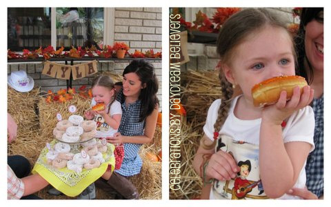 For dessert, we served hot doughnuts and cold apple cider. Cider mills are a big part of Autumn here in Michigan... is that something that people do all across the country? I'm really not sure, but they were a nice change from cake and ice cream and they really complimented our party theme.