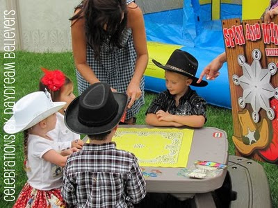 When Iyla's little friends arrived to the party, they each received their very own horse and had the chance to dress up "country style" from a table we set up with cowboy hats, sheriff badges, bandannas and glittery star stickers. Miss I* loves to play dress up, so it was fitting to have a dress up station at her party.