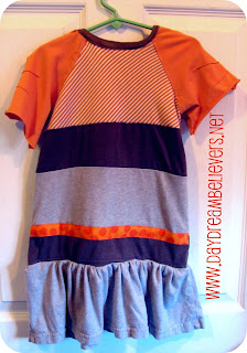 I love, love, LOVE to refashion! These upcycled dresses were both made using a few of my maternity tops and one of the hubs' old t-shirts. The total cost for both dresses = $0! LOVE that! ;)
