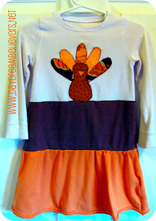 I *heart* Miss V's sweet little dress with the funky turkey applique' - perfect for my lil gobbler! ;) I handmade the applique using bits of fabric from my scrap-bin.