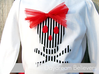 “pirate” striped fabric. To keep the shirt girly, I embellished the