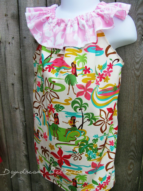 I love the sweet pink hibiscus flowers on the ruffle neckline!