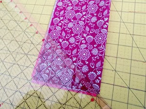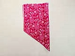 Step One: Stack both 10x9” pieces of fabric, fold the pieces in half lengthwise and press. Mark a point along the raw edges at 4.5” from the bottom. Using a ruler, cut at an angle from the 4.5’ mark to the end of the fold to shape the bandana. Unfold and press.