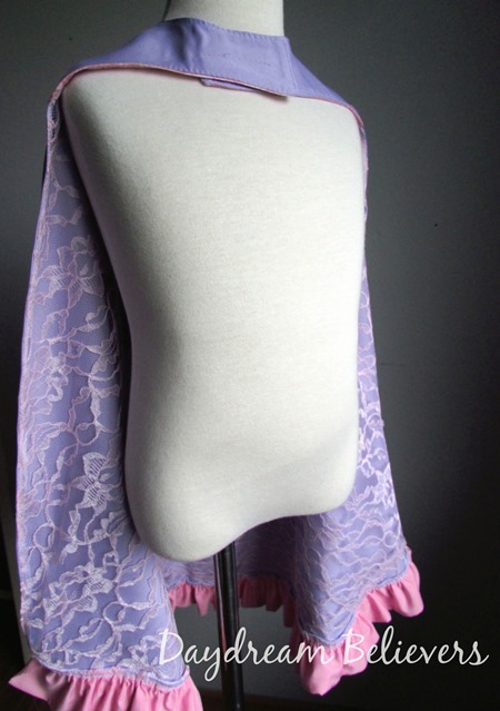 The girl capes are lavender (the wedding color!) lined with pink lace and embellished with handcrafted ruffles. The flower girl emblem features a soft pink floral back round topped with hand cut lavender applique in each of the girls’ initials.![]()