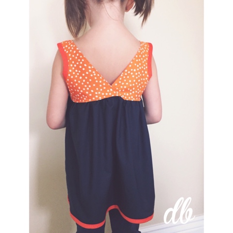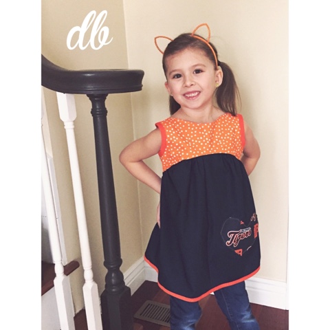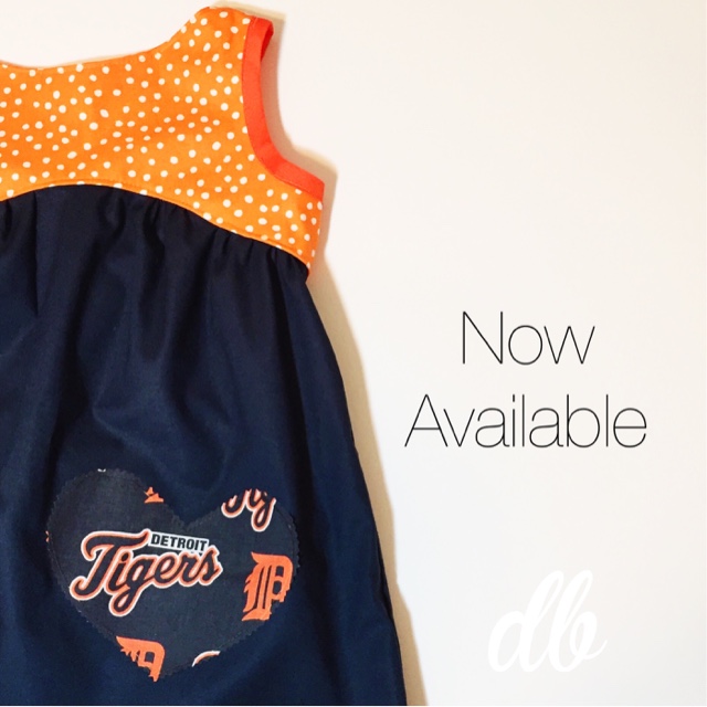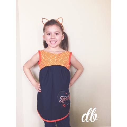This version of Bree was designed especially for the Tigers fans in navy blue, orange and white. It features a loose, gathered skirt, a fully lined bodice, rounded neckline and stylish "V" back. -- My girls love the fit of this top and the handcrafted TIGERS heart applique that embellishes the bodice; I know that your girl will too!