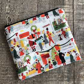 Confession - I am zipper pouch obsessed! I have little pouches all around my house, in every bag, in my car. I fill them with so much more than just coins, makeup and pens - oh man - little zipper pouches are my secret weapon for organizing my busy life! Except not such a secret now because I’m sharing them with you! I hope you’ll enjoy my favorite size 7 x 7.5. The outside fabric is an out of print cotton that features delightful Christmas shopping scene - 1960s vibe clothing, smiling Santa, fun pops of mod yellow, orange, and kelly green. I’ve lined each bag with a green and white dot print cotton, and topped it with a deco metal zipper. I put these bags to work, so each bag is fully lined with organic fleece for added strength and durability. $18.50